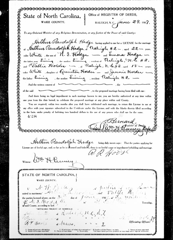 Rather than fight it out at home, the young couple made a plan. Sixteen-year-old Vallie (who stated she was 18 on the marriage license) began secretly moving her clothes piece by piece to her best friend’s house. When everything she owned was hidden away, she told her parents she was going to spend the night with that friend—instead, she and 22-year-old Arthur slipped into Raleigh and eloped on June 30, 1907.