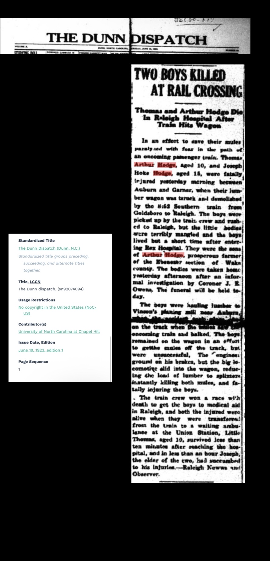 On June 16, 1923, Vallie’s world shattered. Her two sons, Jasper and Thomas, were hauling lumber with a mule-drawn wagon. As they crossed the railroad tracks—something they did every day—they didn’t see the oncoming train. They tried desperately to save the mules, fearing their father’s anger if they lost them. They never made it off the tracks. Thomas was killed instantly. A mortally wounded Jasper died shortly after.