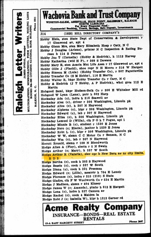 Their first child, Jasper Hodge, was born on June 7, 1908. Vallie stayed home to care for him while Arthur worked as a farmhand. Soon came Thomas A. Hodge, born August 29, 1912, then a little girl—Flonnie Clay Hodge—on October 11, 1914. Flonnie would become my great-grandmother. Their family was completed with the birth of Chloe Belle Hodge on July 30, 1916. The family lived in an unpainted frame house about six miles east of Raleigh down a dirt country road that connects Poole Road and Rock Quarry Road when Chloe was born. This house was torn down not long after they moved.