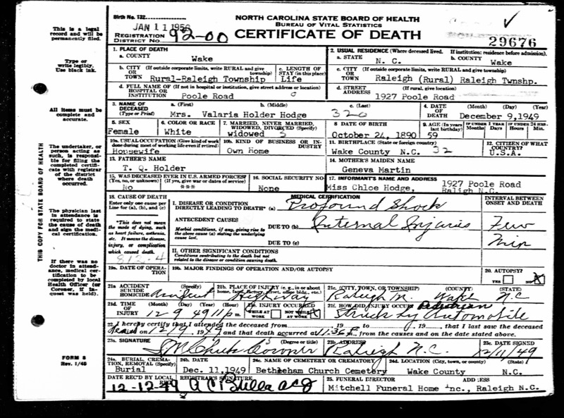 She was the third of seven daughters born to Thomas Quincy “Quint” Holder (38 at the time of her birth) and Geneva Elizabeth “Ginnie” Martin (just 22 when Vallie was born). The family lived in St. Mary’s Township in Wake County, an area now part of downtown Raleigh. Money was scarce, but family was tight.