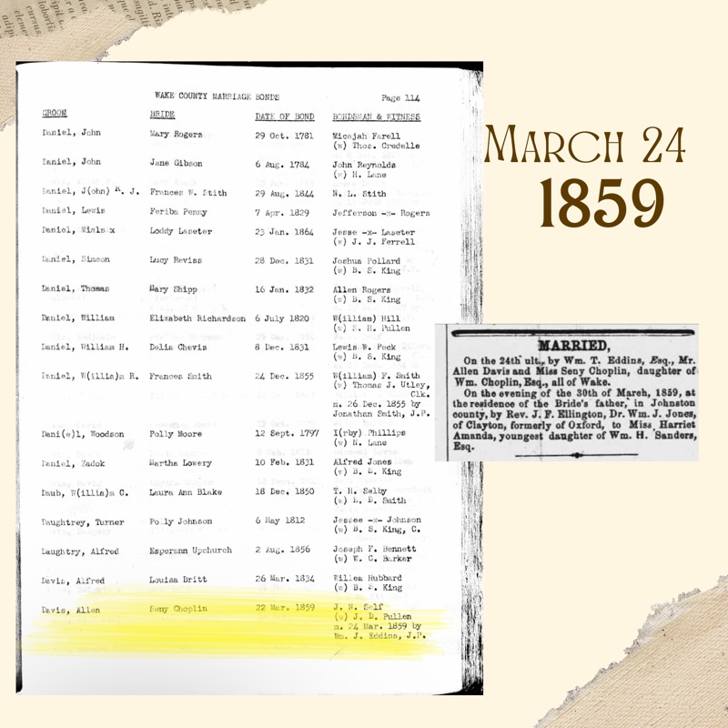 On March 24, 1859, 23-year-old Allen Davis married 28-year-old Lucretia “Seny” Joplin, the aunt of the much-discussed Ticy Ann Joplin. The ceremony was performed by William T. Eddins, a name that will resurface in unexpected ways later in Allen’s story.