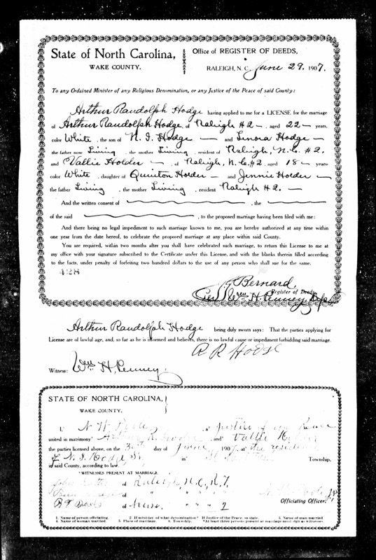 The reason given was Arthur’s weekend drinking—an objection that appears often in Wake County family stories of the era. Convinced marriage was the only way forward, Vallie quietly planned an elopement. Day by day, she slipped one article of clothing at a time to her best friend and neighbor’s house. When everything she needed was safely hidden, she told her parents she was spending the night with her friend. Instead, she slipped away with Arthur to Raleigh, where they were married by Justice of the Peace N. W. Poole.